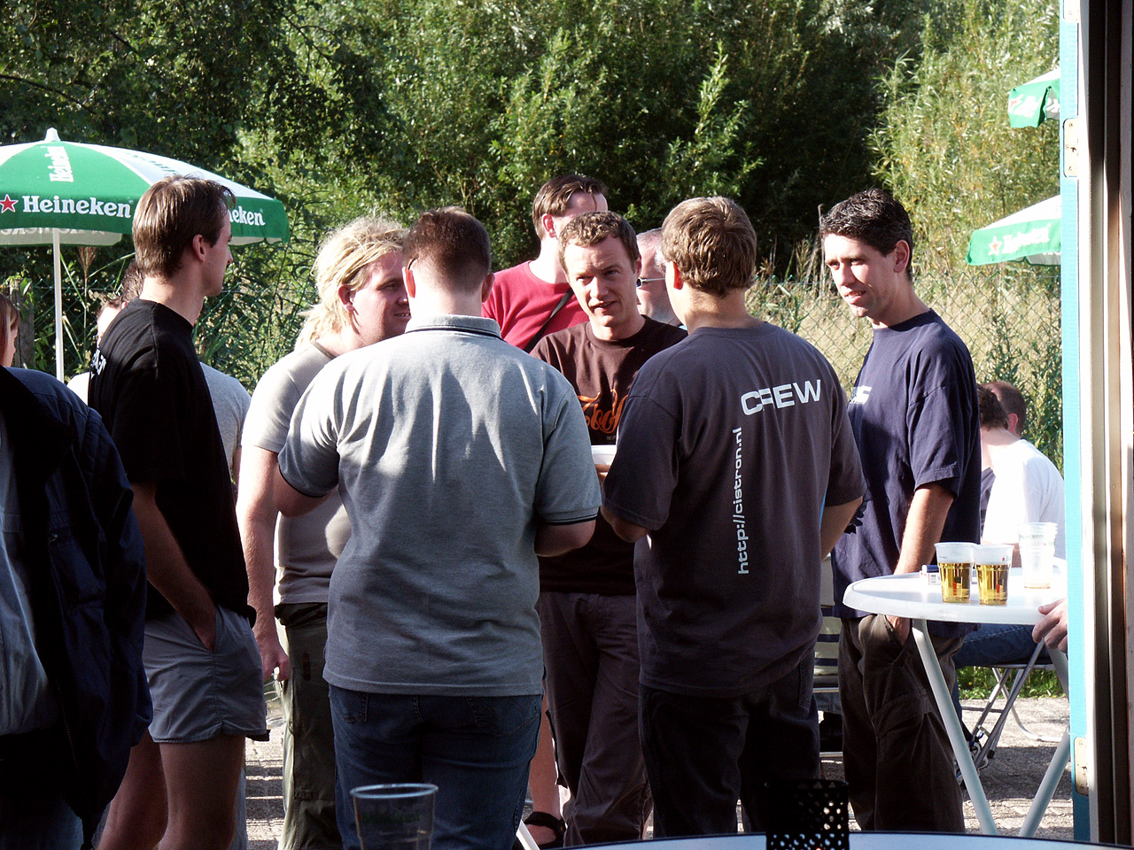Het idee schemerde natuurlijk al wat in augustus; Op deze foto zien we van links naar rechts: Ruben “Tjoeketjoeketjoek?” Raijer, Marcoh (demon), Niels Raijer (ex-demon), Erik Bos (xs4all), Danny ter Haar (cistron) en Cor Bosman (xs4all), die overigens geen bier drinkt, ook al lijkt dat hier wel zo.